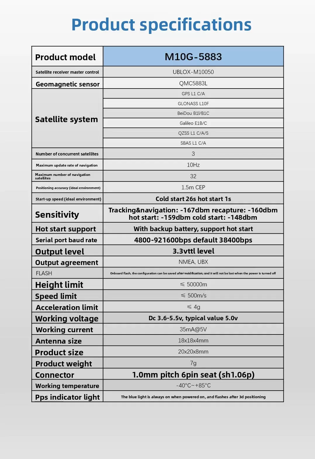 The M10G-5883GNSS module adopts Ublox's latest generation chip M10, which has strong performance and faster star search speed. It can use up to 32 satellites and has precise positioning. The onboard high-performance geomagnetic compass sensor QMC5883L is only 20 * 20 * 8mm in size, and is mini and easy to install. It adopts high-performance and small volume imported antenna, with a compact design and no performance loss. The weight is as light as 7g, which is very suitable for small time traveling machines/circle machines/lightweight fixed wings